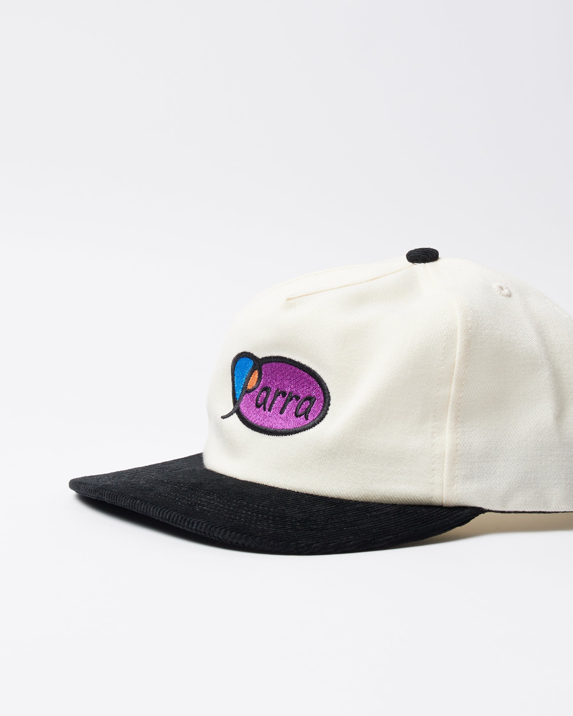 フロントにCircled scriptロゴの刺繍を施した5パネルハット。バイザー、トップボタン、スナップバックをコントラストカラーで切り替えています。