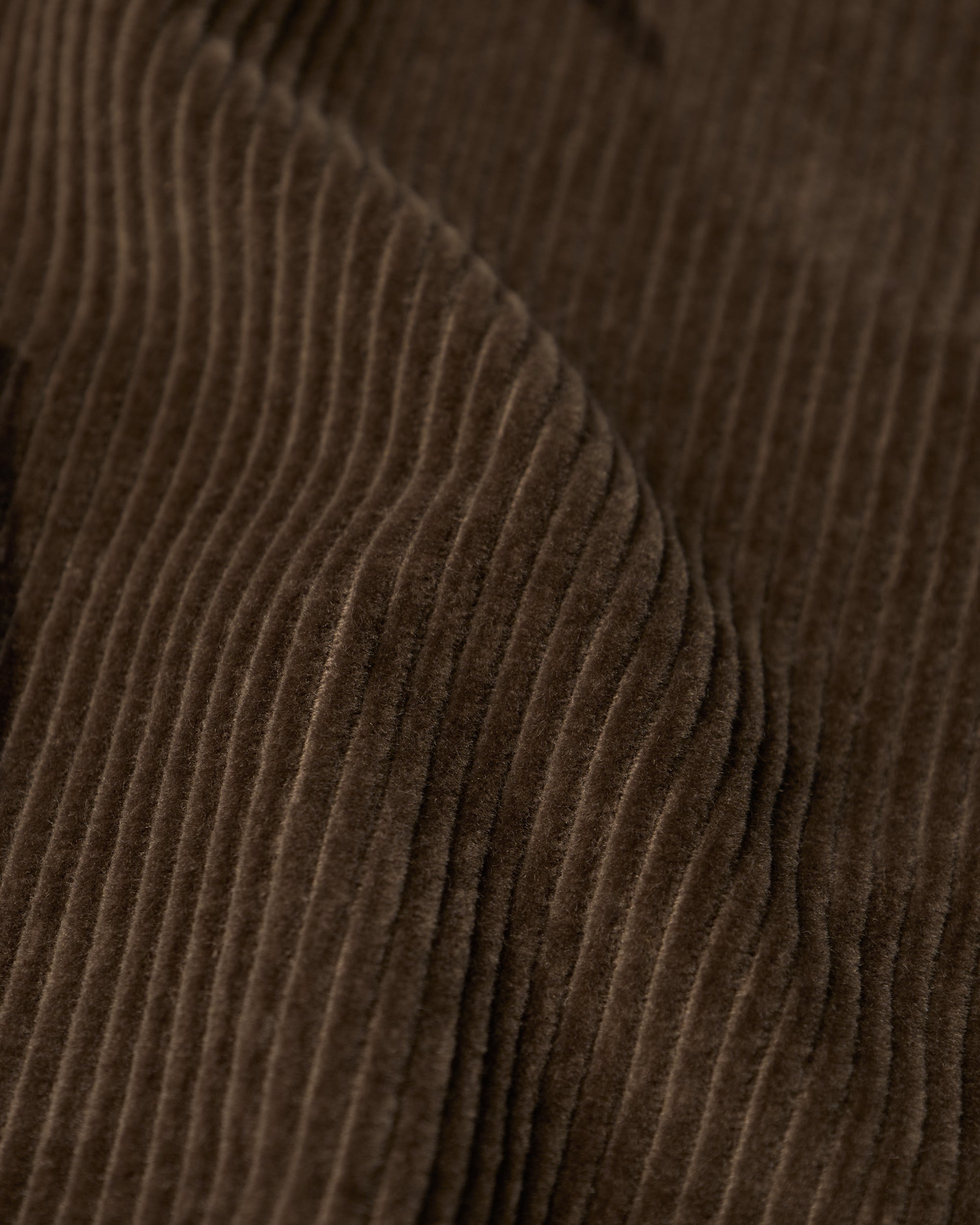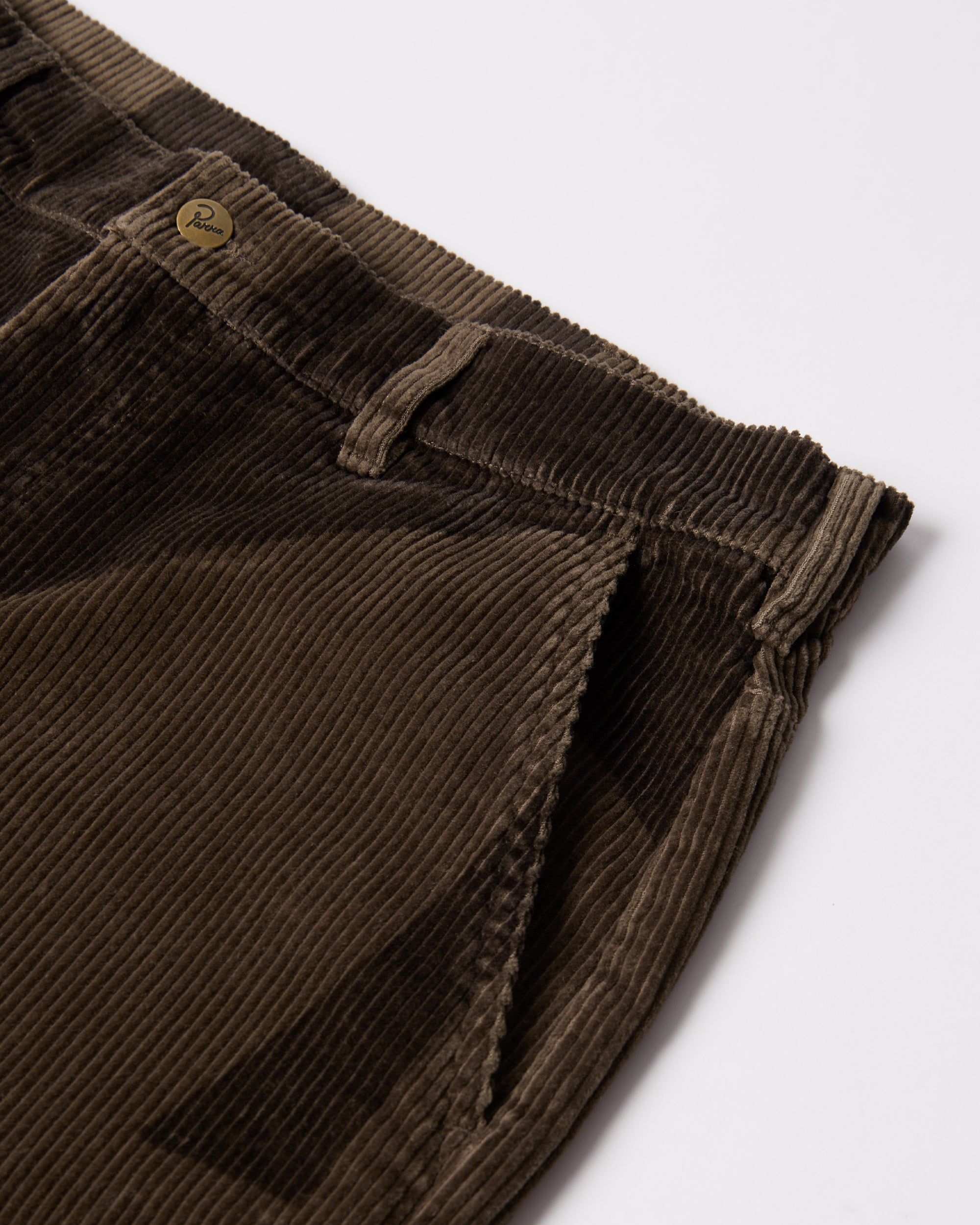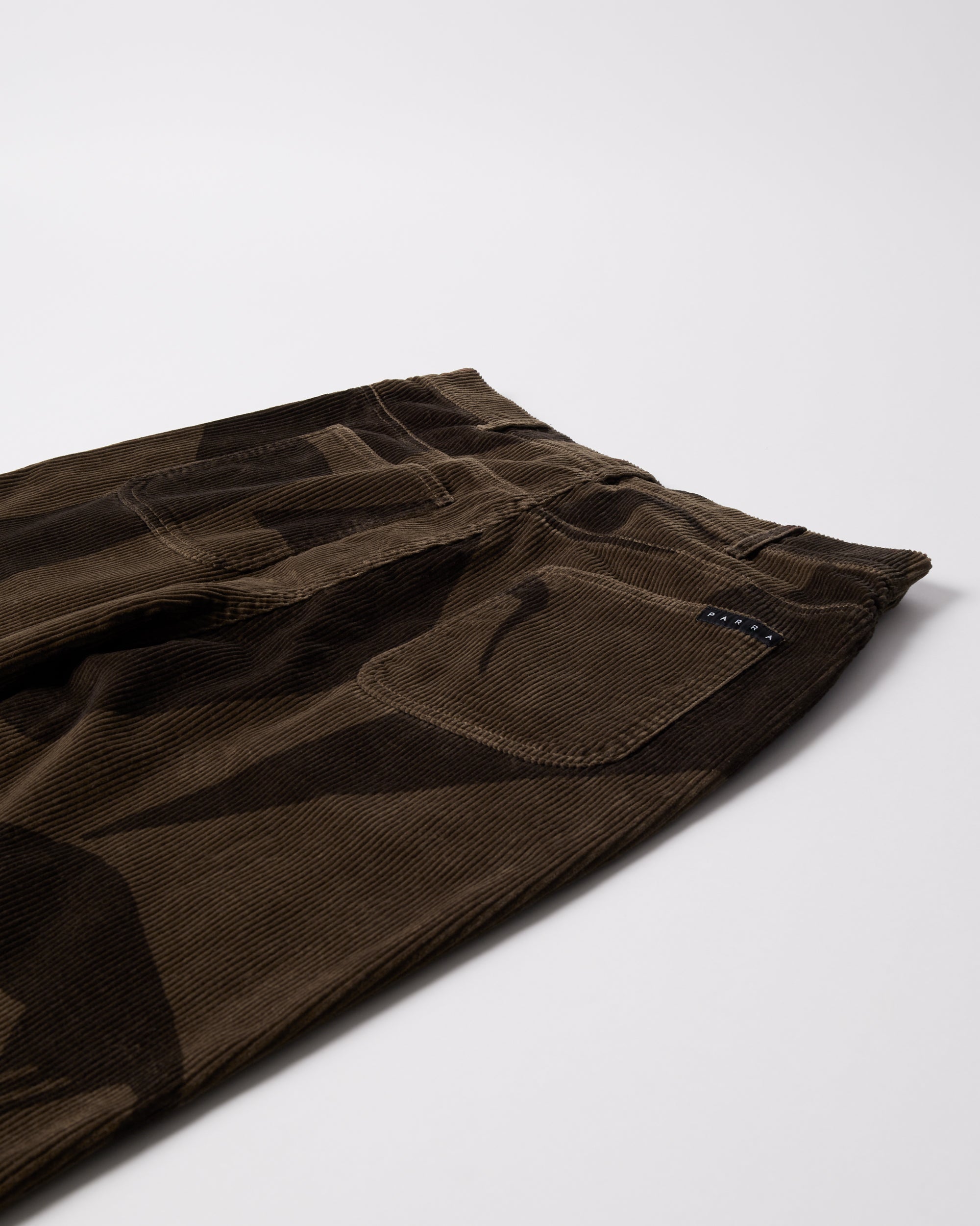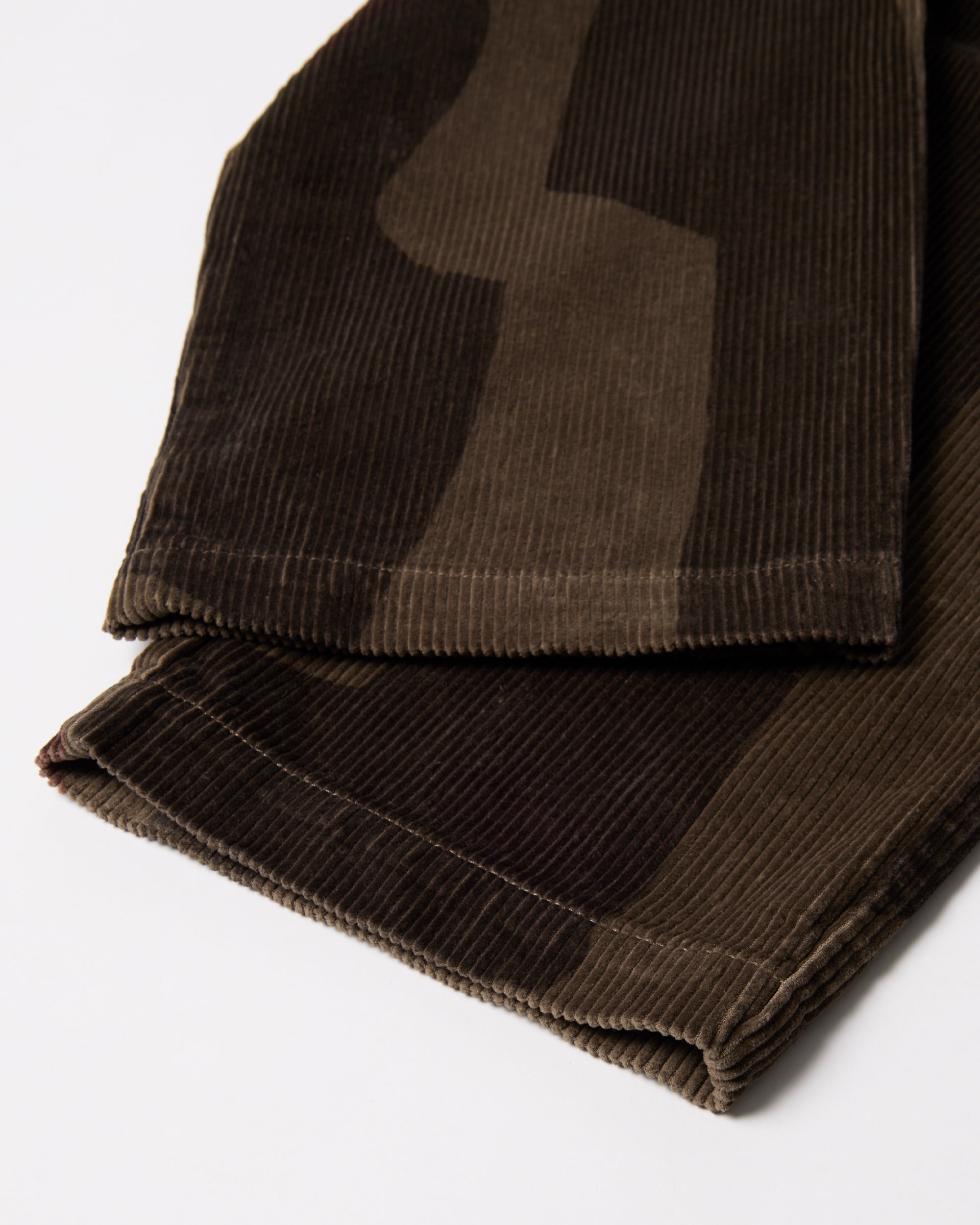 「Detached」のアートワークをランダムに配置したサーフェスプリントを施したコーデュロイパンツ。