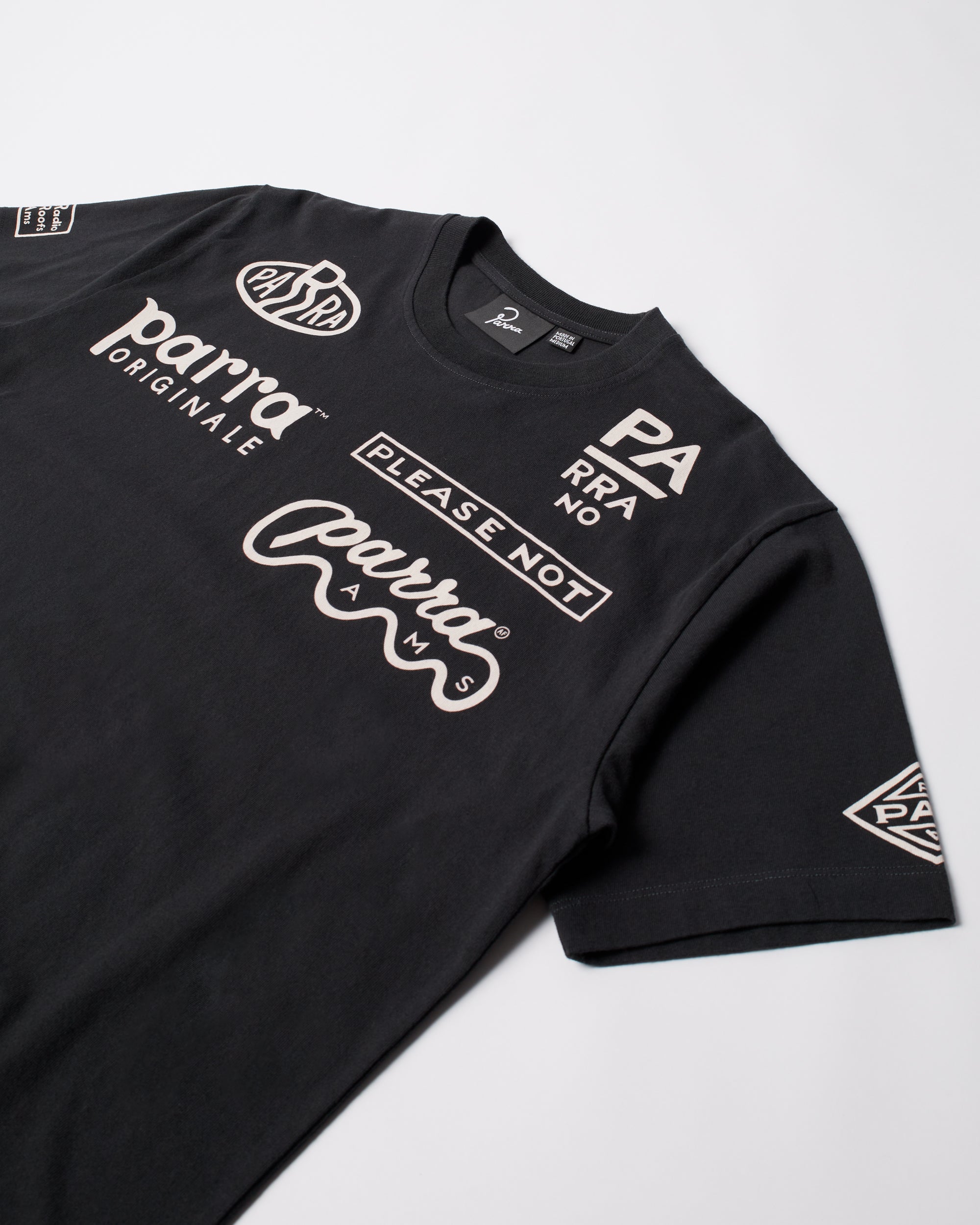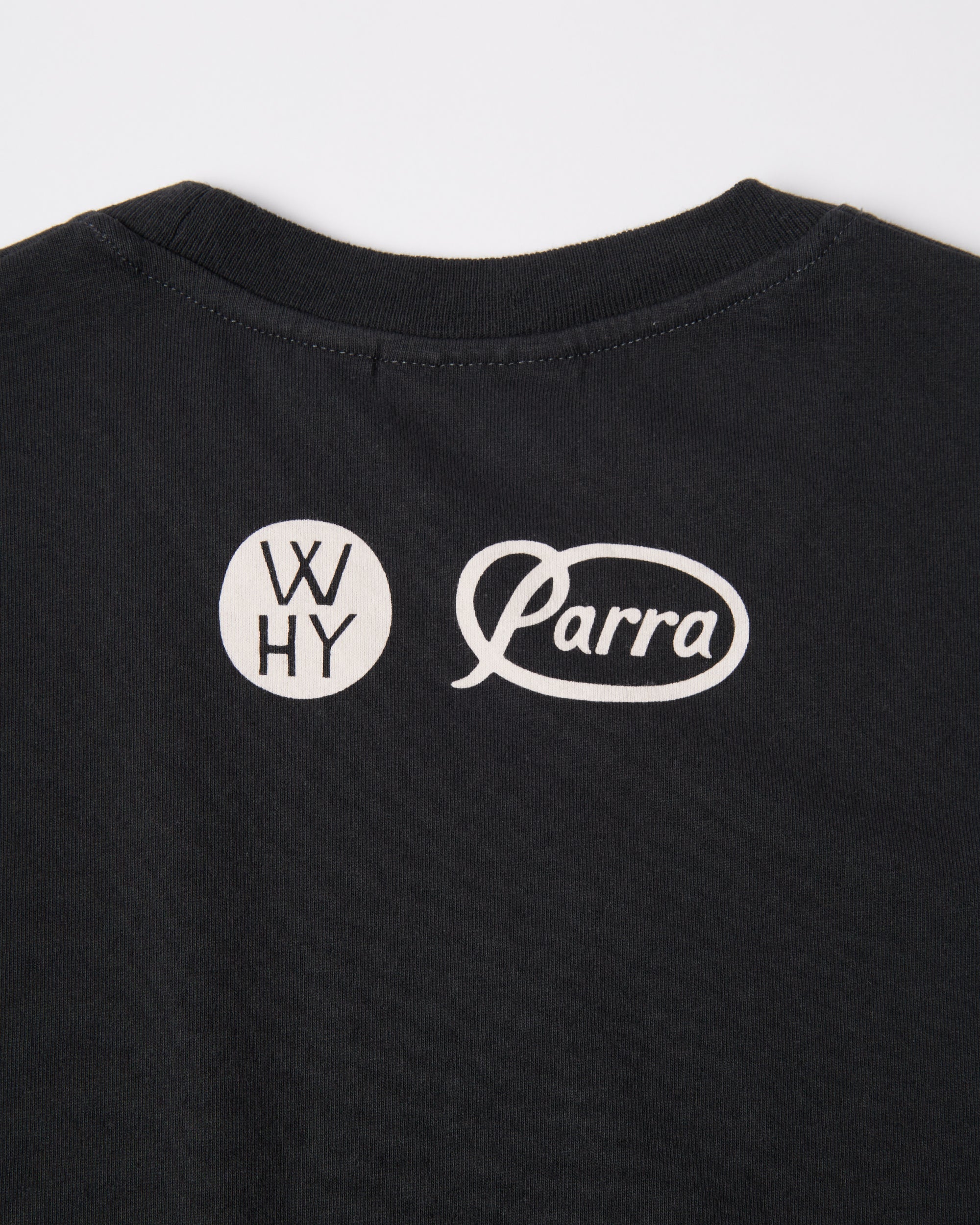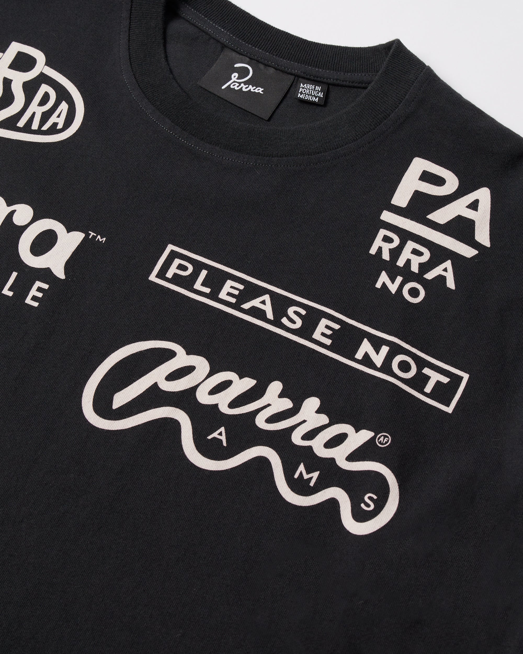 さまざまなParraロゴを組み合わせたデザインを、抜染プリントの上から水性スクリーンプリントで施しています。