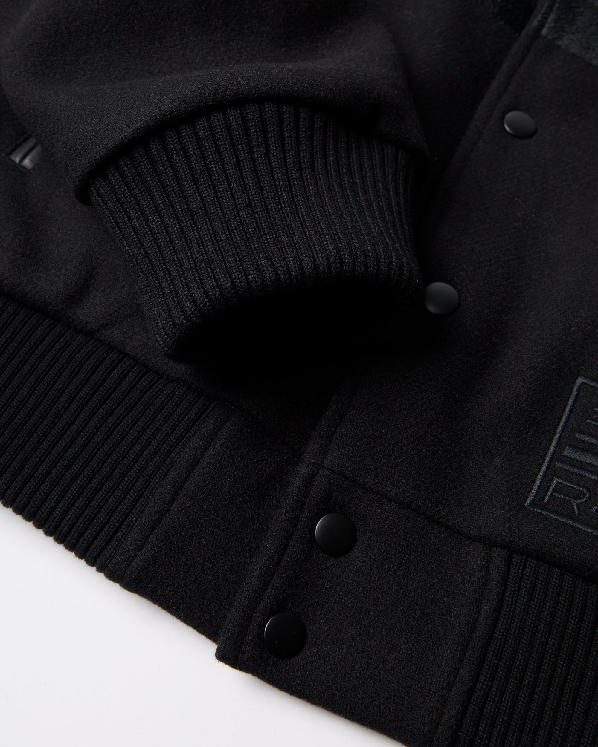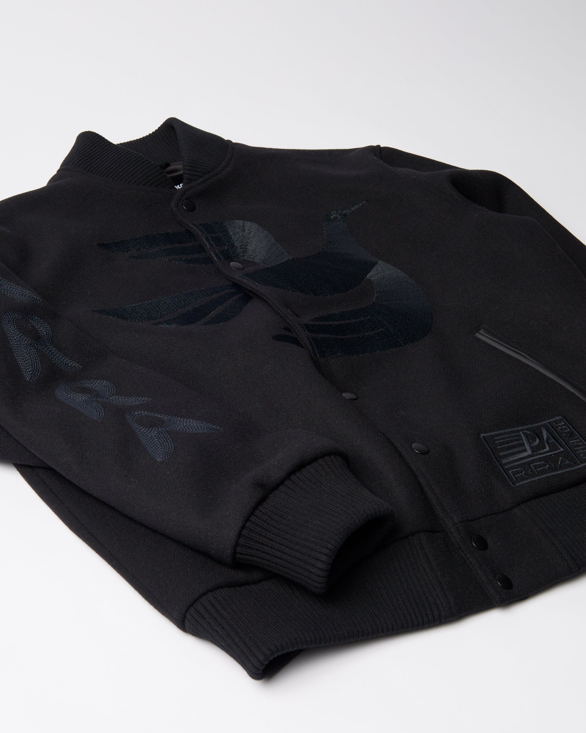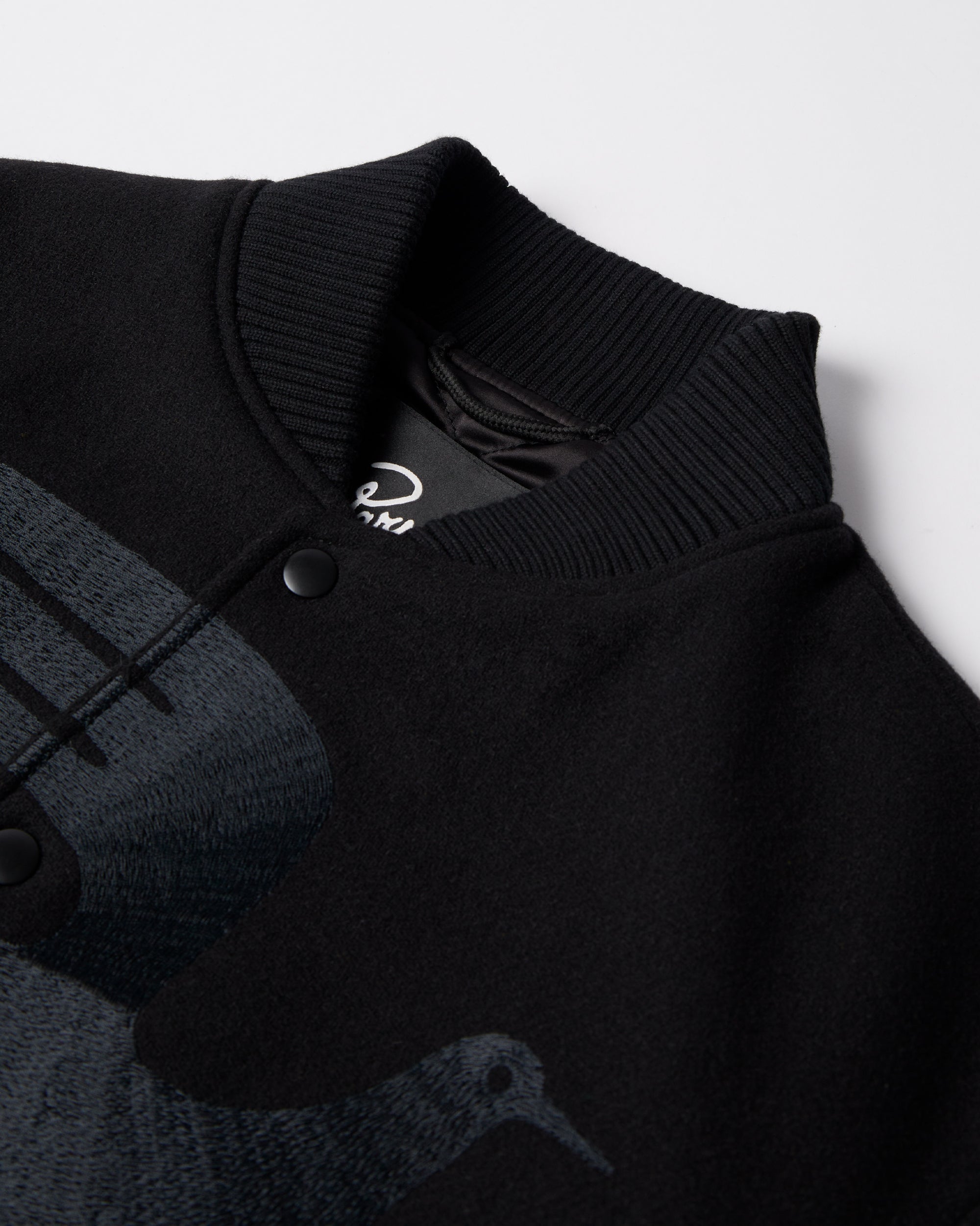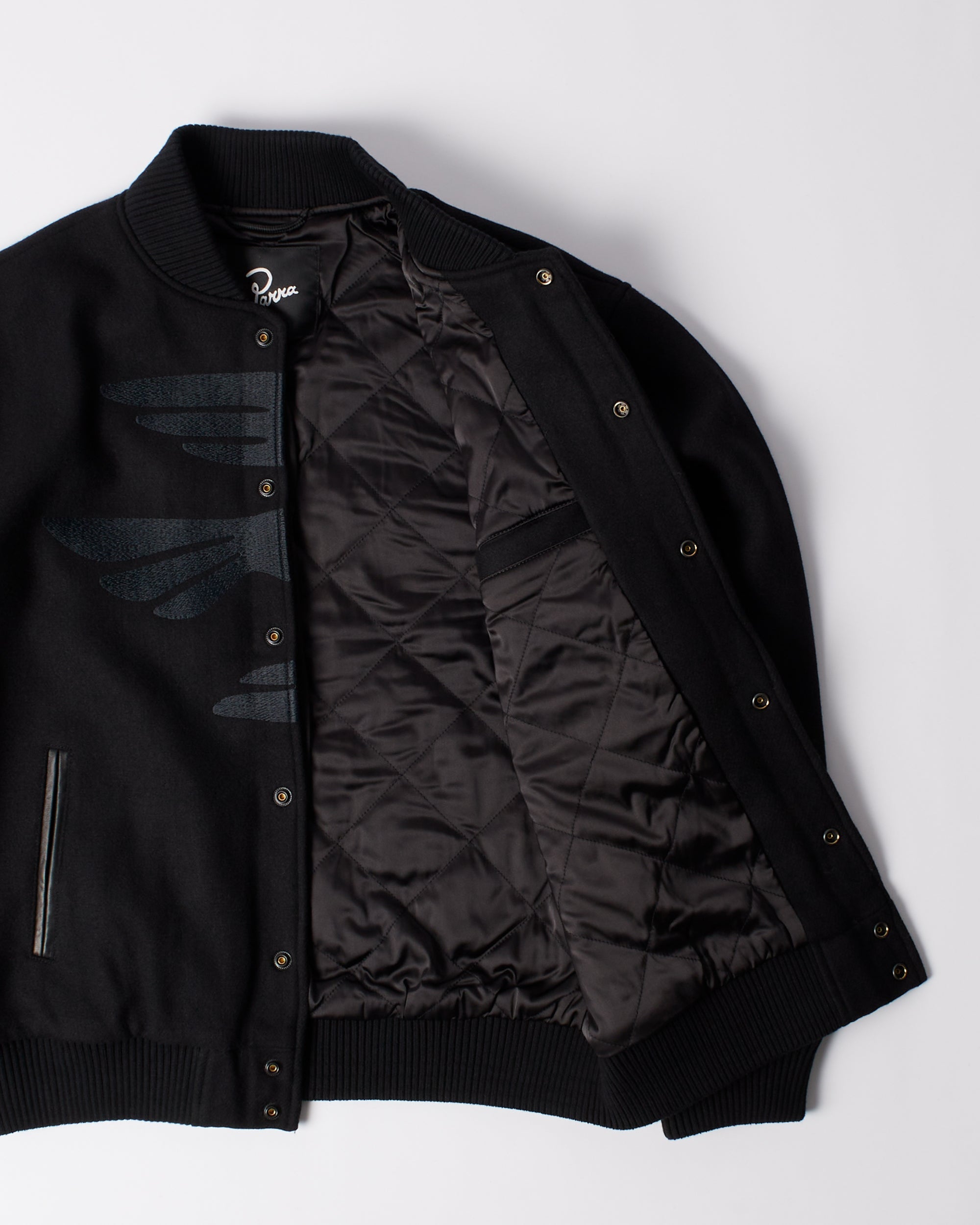 ウールブレンド素材を使用したクラシックフィットのバーシティジャケット。トーナルカラーの大きな刺繍を全面に施しています。