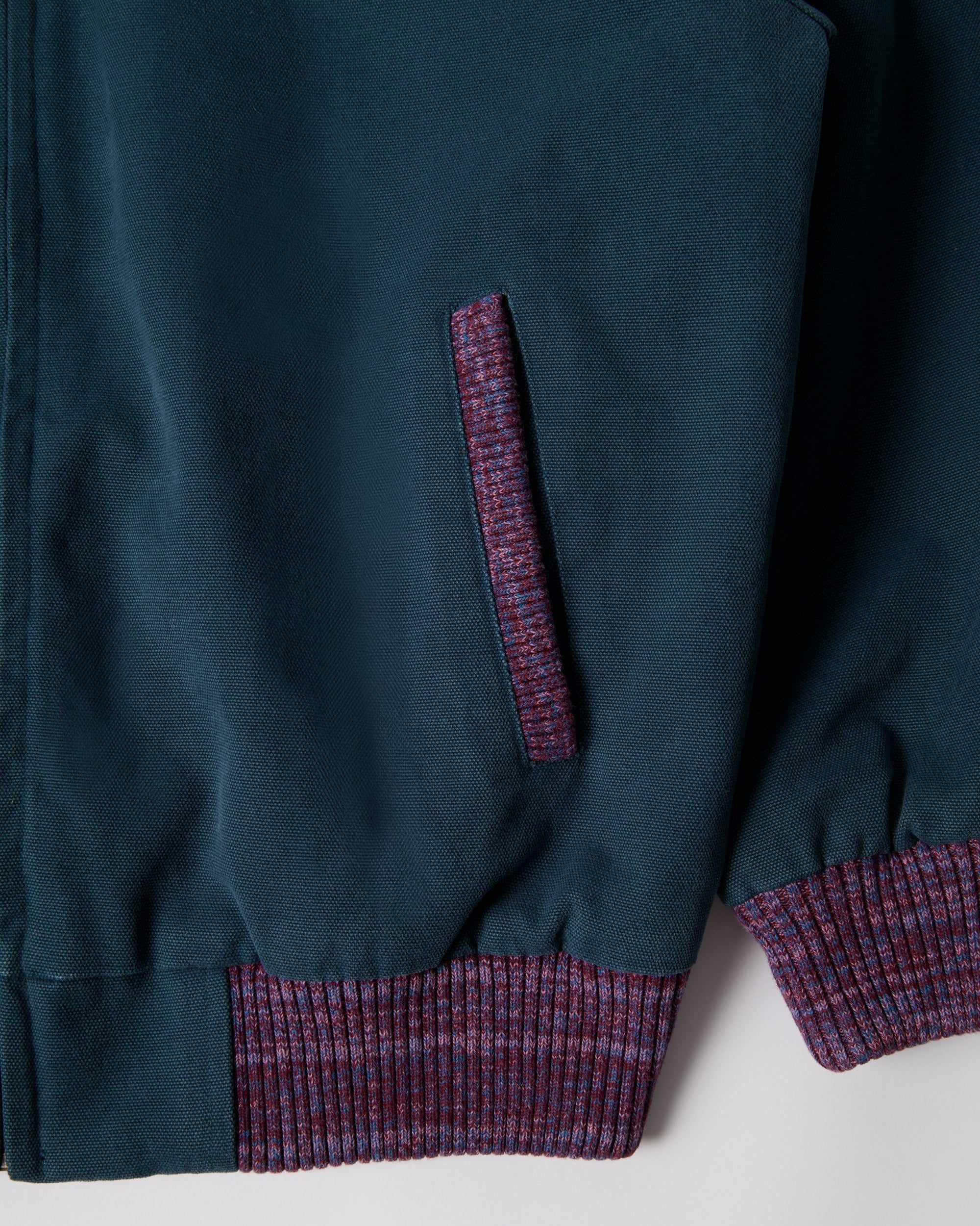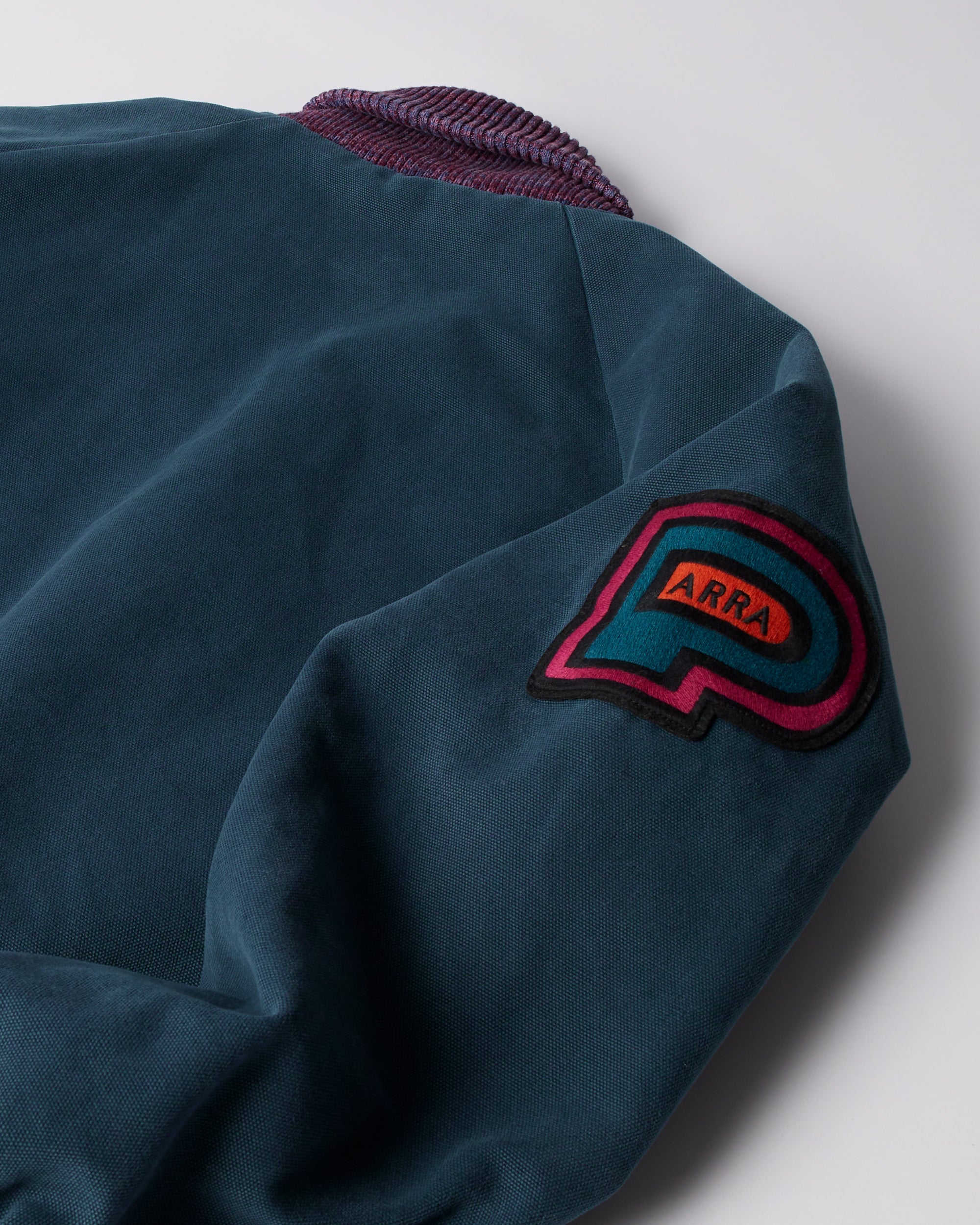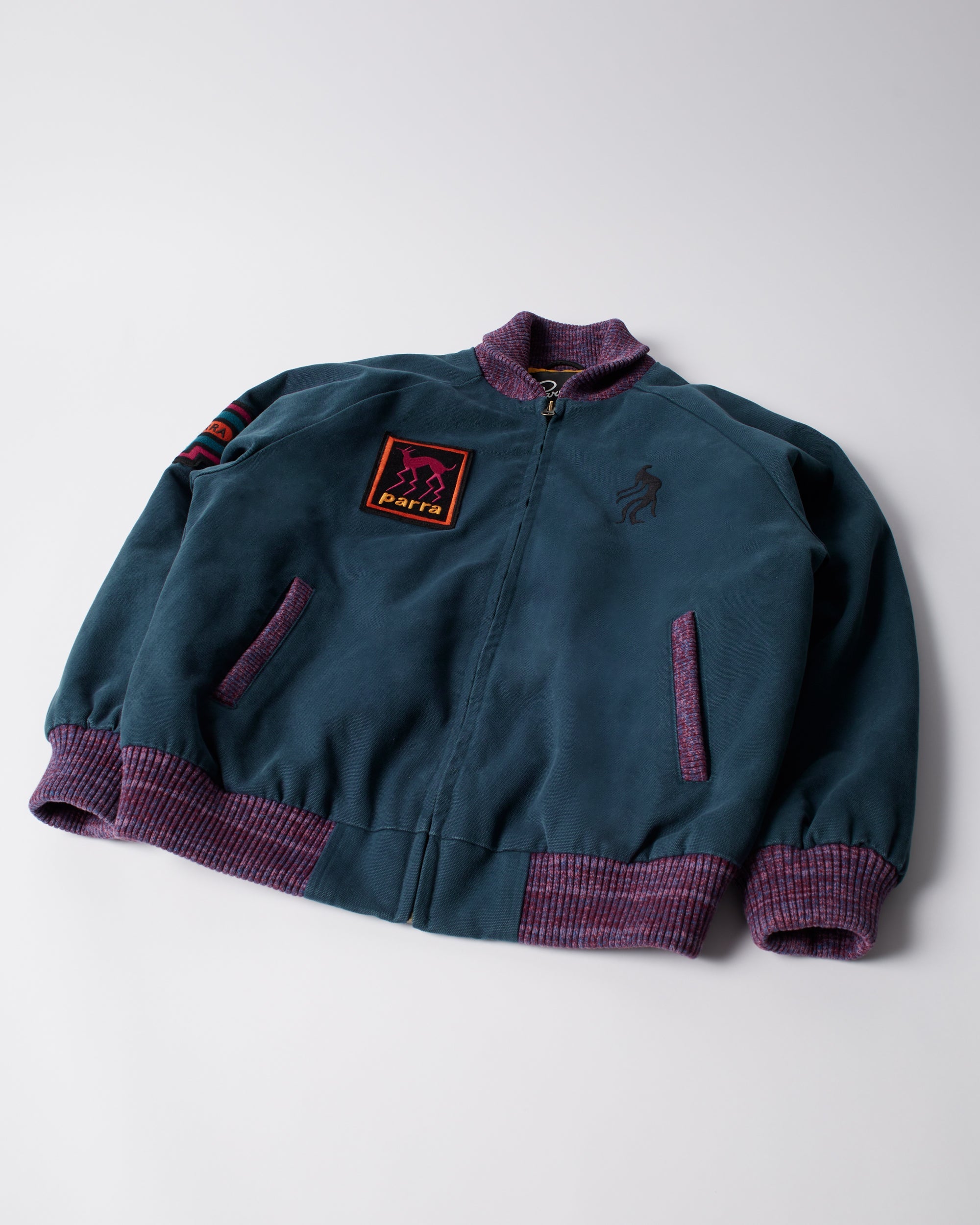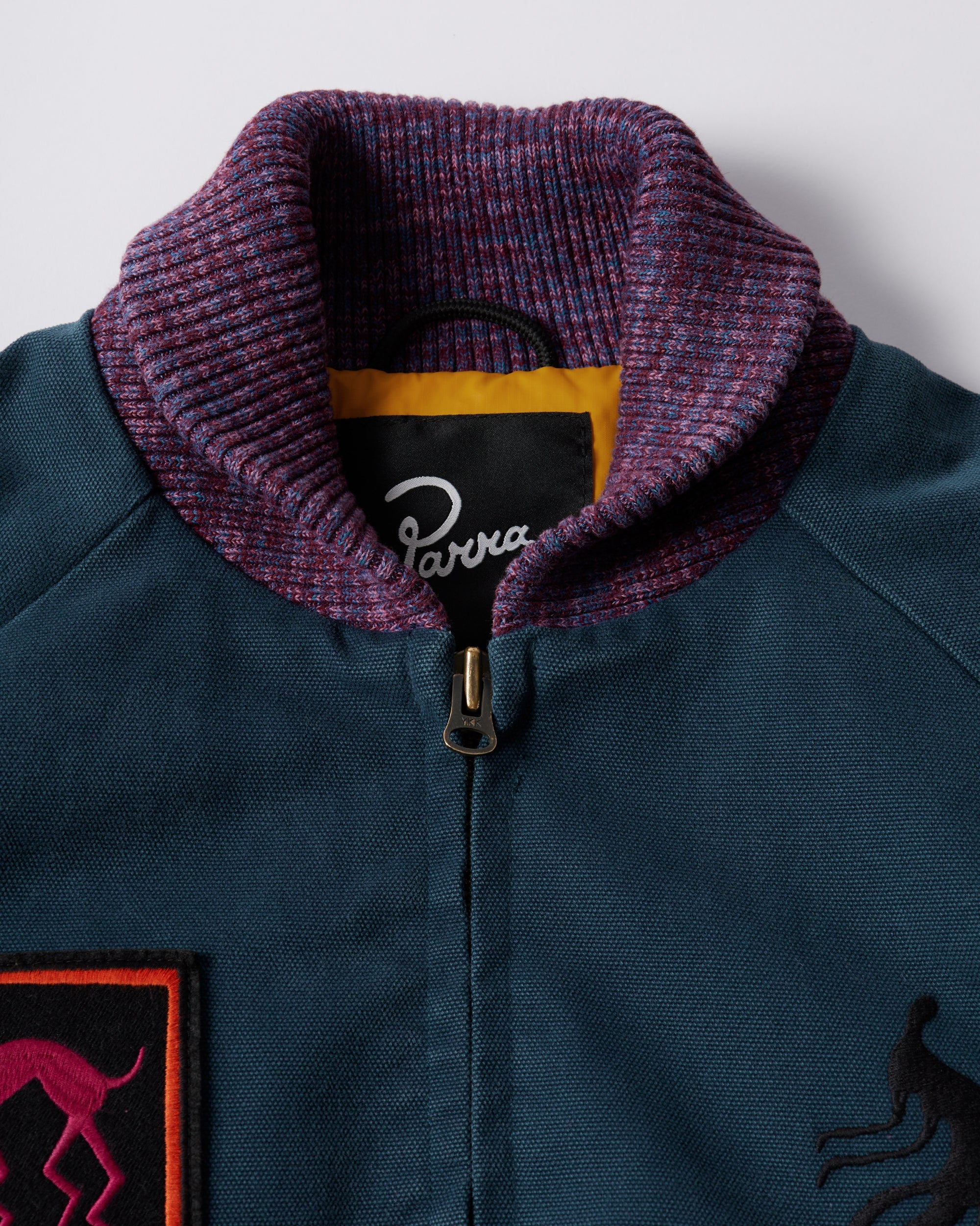 コットン製のヴァーシティジャケット、クラシックフィットで折り返しカラー付き。胸元には「Skull Stalker」の刺繍、胸元と袖にはアプリケーションが施されています。内側の裏地にはアートワークがプリントされています。