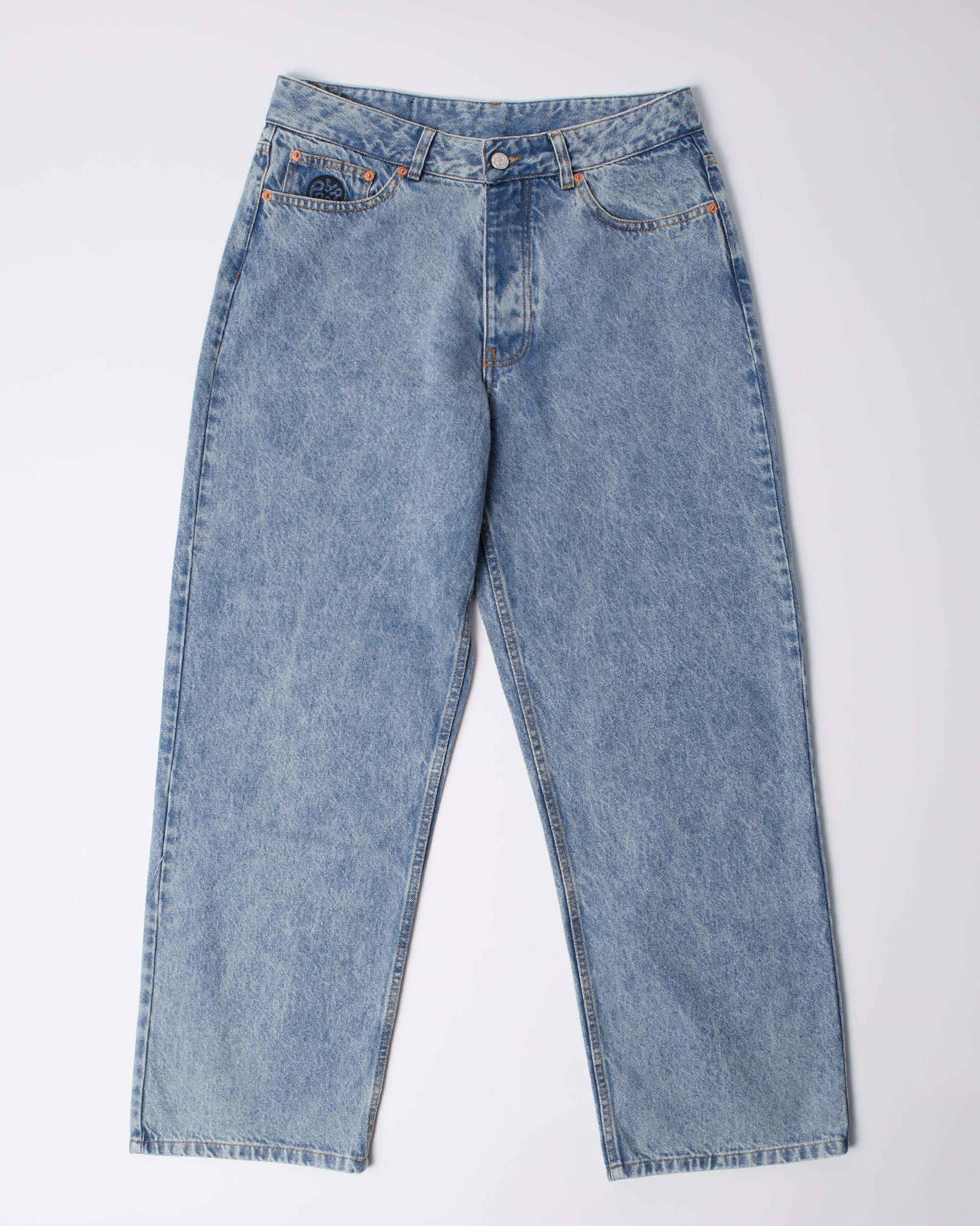 ストーンウォッシュ加工を施したデニムパンツ。刺繍パッチとコインポケットにロゴ刺繍を施しています。バギーでリラックス感のあるフィットです。